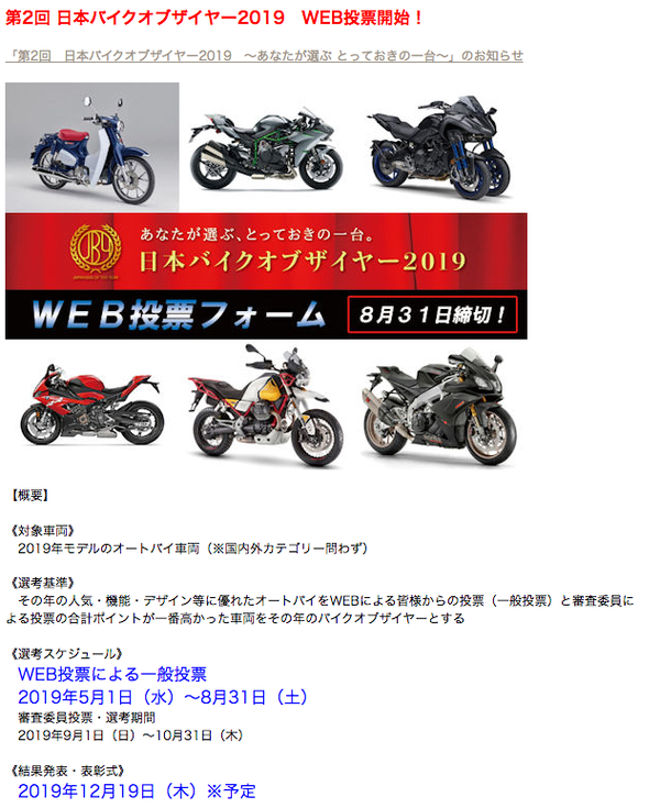 第2回 日本バイクオブザイヤー2019 2025年12月30日2019年8月15日 by モトコト記事より 「第2回 日本バイクオブザイヤー2019」のweb投票が開始した模様! 締め切りは8/31だそうです。motocoto編集部も投票しよっと♪ みなさんもいかがですか!? 投票はここから→http://www.amac.or.jp Facebook で共有するにはクリックしてください (新しいウィンドウで開きます) Facebook クリックして X で共有 (新しいウィンドウで開きます) X クリックして印刷 (新しいウィンドウで開きます) 印刷 関連