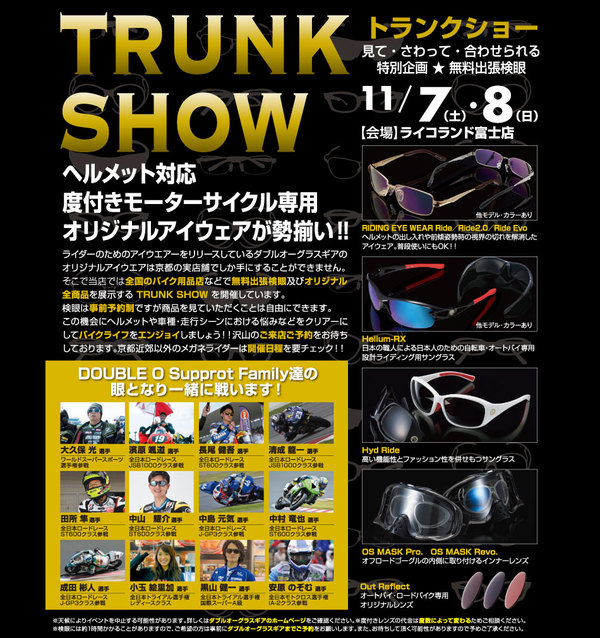 バイク乗りのためのアイウエアを取り扱っているダブルオーグラスギア。京都のお店を飛び出して、全国のバイク用品店で出張販売ツアーを開催中