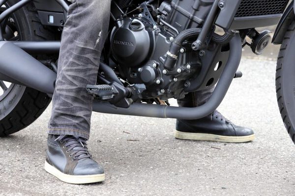 レブル 250はクルーザースタイルのため一般的なロードスポーツと違い、シートの着座位置よりも前方にステップがあるのが特徴のひとつ。