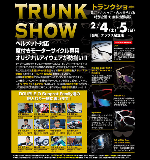 ダブルオーグラスギアでは、日本人のフェイスラインに合わせてカーブした前傾姿勢になっても広い視野を確保できるレンズや、ヘルメットをかぶったままでも脱着しやすいのにズレにくいフレームなど、ライダーに嬉しい工夫がてんこ盛りの商品が多数ラインナップされています!