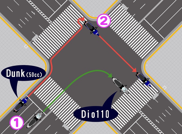 Dunkは信号が変わったら①から②へ進み、もう一度信号待ちをする必要がある。Dio110はそのまま右折可。