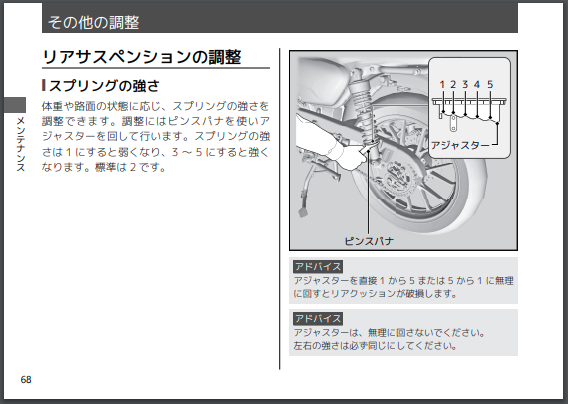 これらは愛車の取扱説明書にも「リアサスペンションの調整」として書いてあることですが、スプリングの強さはライダーの体重などに合わせて変えることができるものなんです。