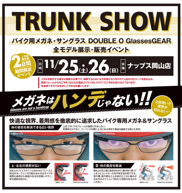 岡山県のナップス岡山店にて全モデル展示・販売を行うイベント「TRUNK SHOW」を開催します!