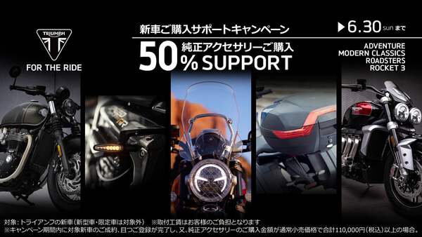 トライアンフ「新⾞ご購⼊サポートキャンペーン純正アク セサリーご購⼊50%サポート