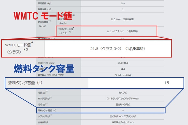 燃費に関しては、スペック欄の「WMTC」モード値とよばれる、公道での使用実態に近い方法で計測されたメーカーが公表する燃費数値を参考にするのがオススメです。