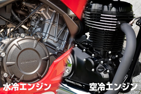 バイクのエンジンには主に2種類の冷却方式があり、LLC(ロングライフクーラント/エンジン冷却用の水)をエンジン内に循環させるためのラジエーターを備えた「水冷エンジン」と、バイクを走らせることによって走行風で冷却する「空冷エンジン」があり、どちらもエンジンの温度を上がり過ぎないようにするための冷却機構が備わっています。