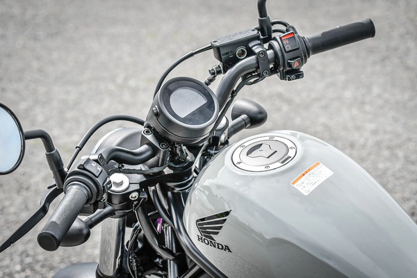 レブル250のハンドルバーは、先の『座る場所が決まっているシート』から手を伸ばすと、体格によってはけっこうハンドルが遠く感じて、腕が伸びきる可能性があります。特に小柄な女性などはそうなりやすいはず。