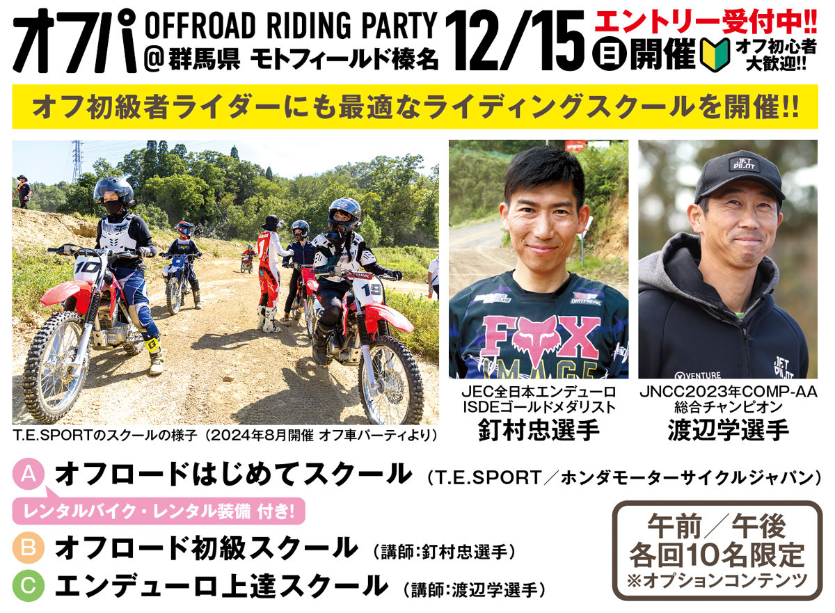 注:釘村選手の「オフロード初級スクール」の午前枠は、11月15日現在完売しています。WEBエントリーはお早めに!