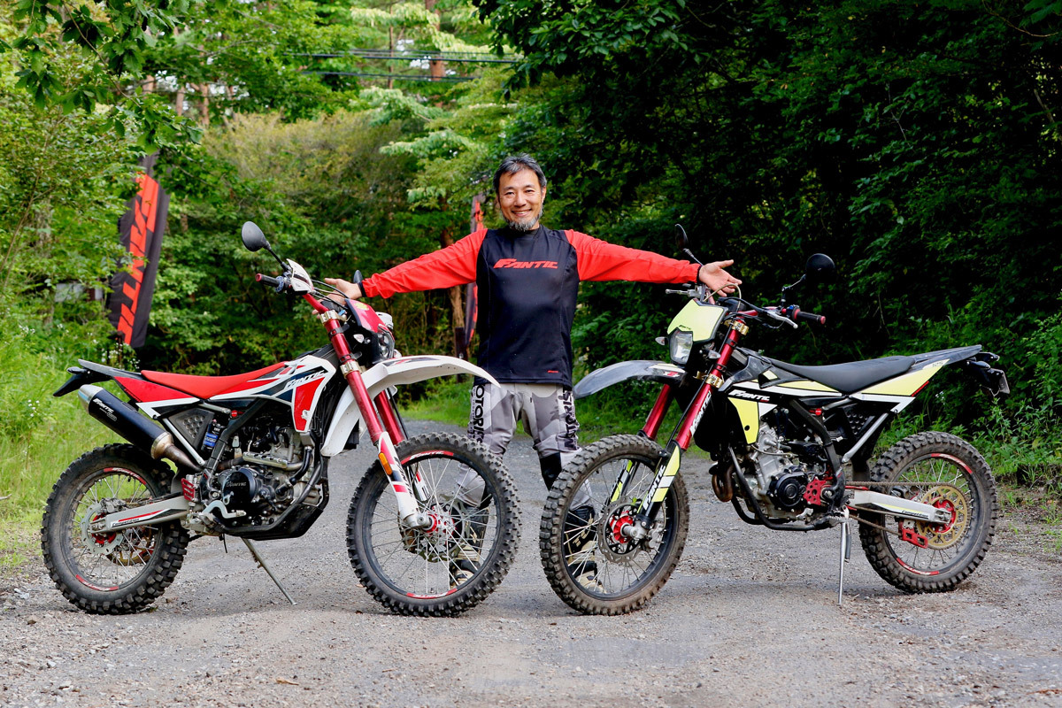 FANTICが誇る技術職人集団のミナレリ製水冷4ストロークSOHC単気筒を搭載した、ハイグレードトレールモデル(写真左)。扱いやすく、耐久性のあるエンジンに合わせて、クロモリフレーム、アルマイトのフォークアウター、削り出しのハブなど、随所にこだわりとハイグレードなパーツが散りばめられており、トレールバイクユーザーにもぜひ注目していただきたい一台です!