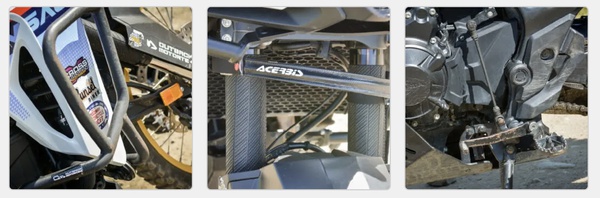 フロントカウルには転倒時にカウル破損を防止するガードが装着されており、傷やサビからこれまで走ってきたオフロードの激しさを物語っています。 フォークにはカバーと同時に、転倒した際やバイクが埋まってしまった際に引き起こしで使えるバンドを装着。 また細かい部分ですがオフロードブーツを履いての操作性を上げるためにシフトレバーを数ミリ延長するなど、ヨッチンさんならではの仕様になっていました。 他にもハンドガードや転倒しても割れにくいミラーなど、本気でオフロードを走れる仕様に仕上がっています。