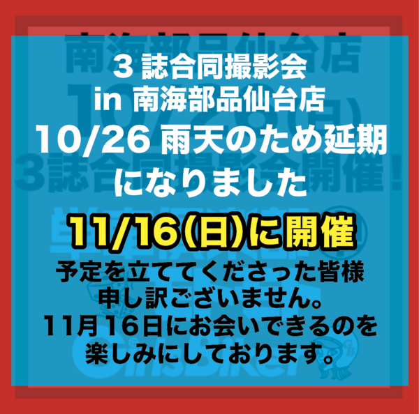 3誌合同撮影会 in 南海部品仙台店 11月16日(日)に延期いたします