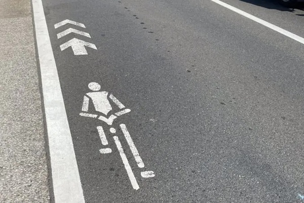白で表示されている自転車ナビマークの部分は、原付が走っても違反とはなりません。