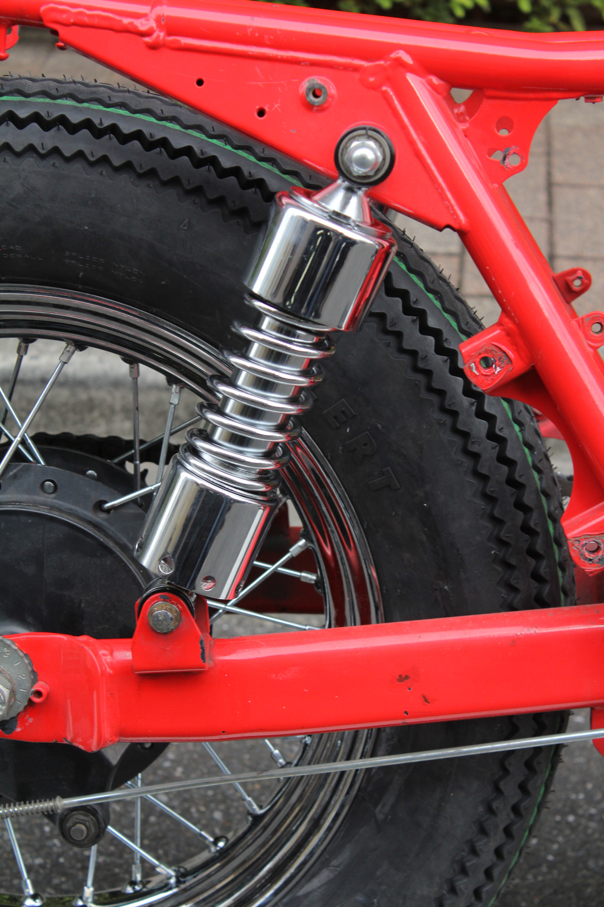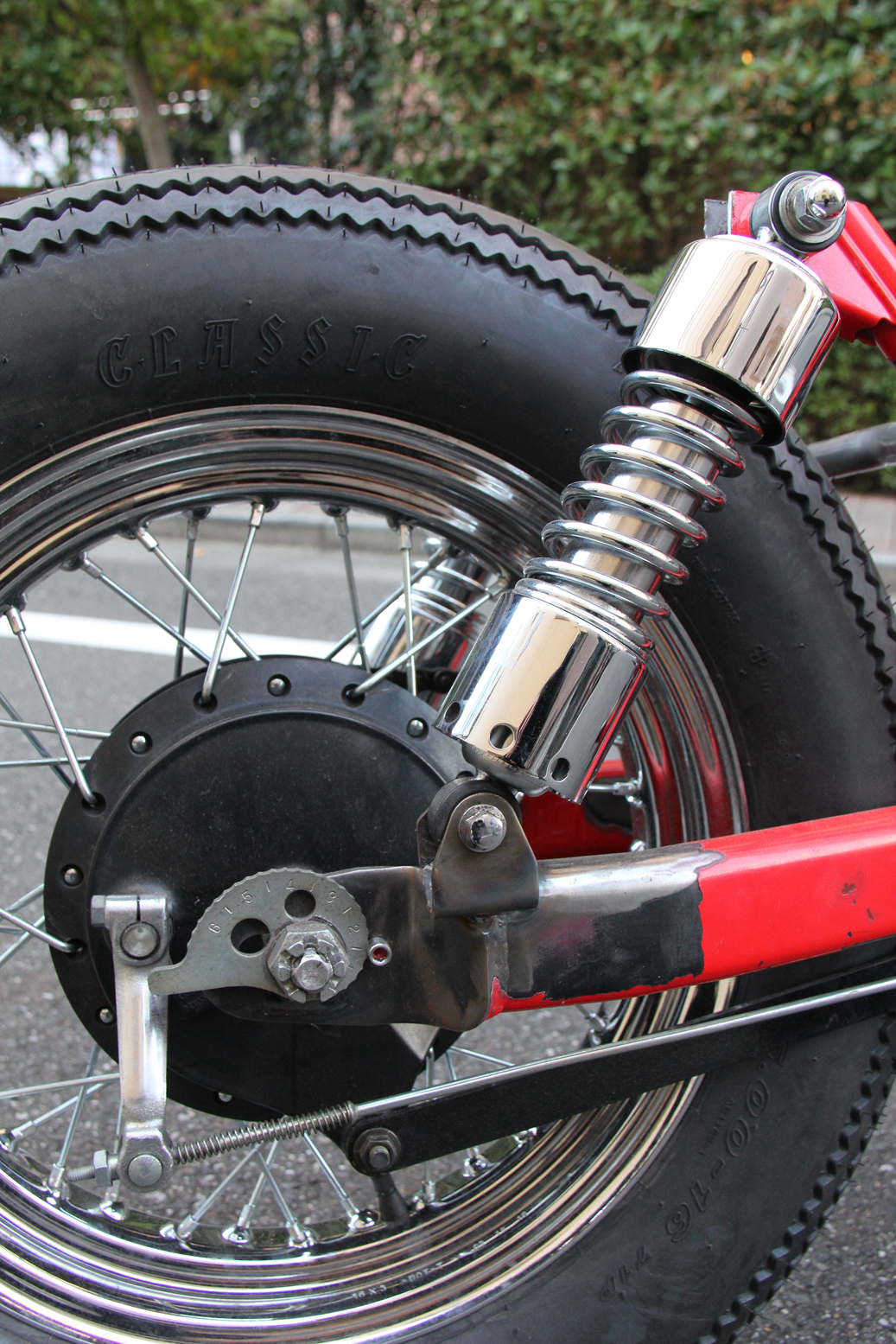 写真の撮り方的でちょっと角度が違いますが、サスペンションの下の取り付け位置を左よりにすることでサスを倒してレイダウンさせているのがわかるかと思います。