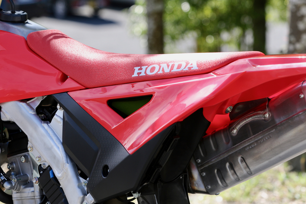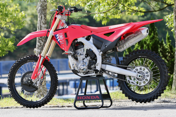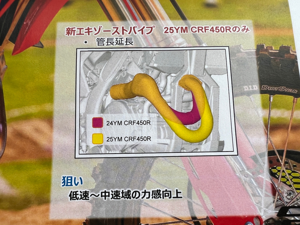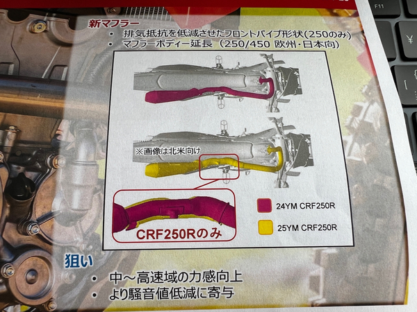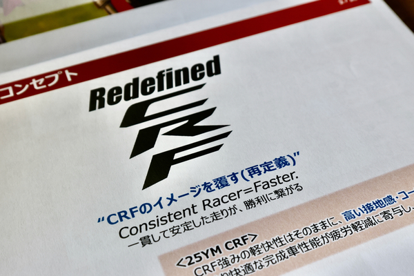 「確かに重量増にはなっていますが、我々としてはウェイトフィーリングには全く現れていないと考えています。ご想像の通りフレームは重量増です。マフラーも延長されています。正確ではありませんが、2kg弱アップしています。ただしマスの集中も図り、操作における軽快感は失われていないのです。軽快性を犠牲にするという考えはありませんから、CRFの良さをいかに崩さずに安定性を高めるかに力を入れました。」とお答えいただきました。