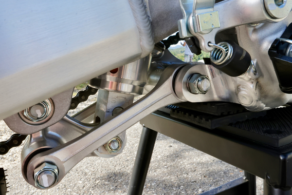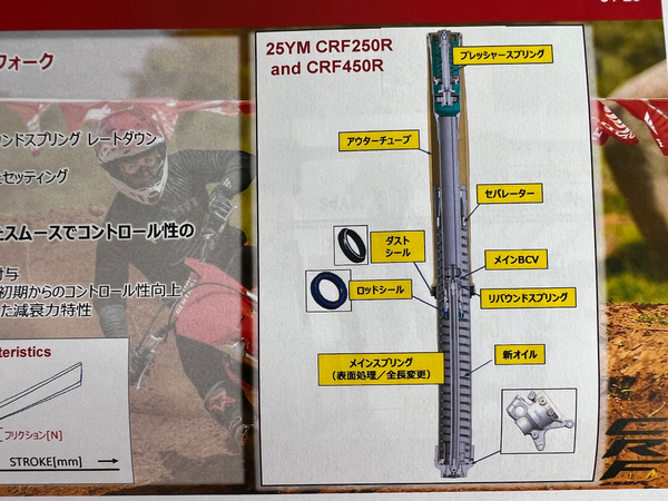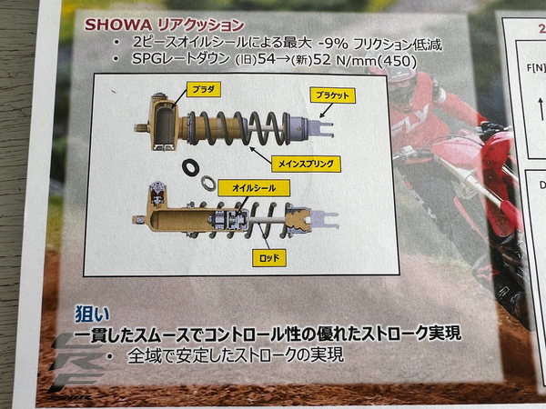 リアクッションは2ピースオイルシールにより、最大−9%フリクション低減。また450スプリングはレートダウン(54→52N/mm)。