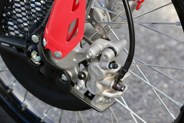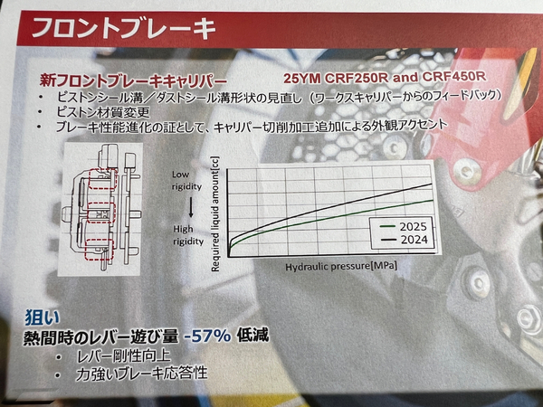 NISSINのフロントブレーキキャリパーも新設計となりました。これはワークスキャリパーからのフィードバックということで、ピストンシール溝、ダストシール溝形状を見直し。またピストン材質も変更。キャリパー切削加工は「性能進化の外観アクセント」だそうです。性能面では熱間時のレバー遊び量が57%低減。