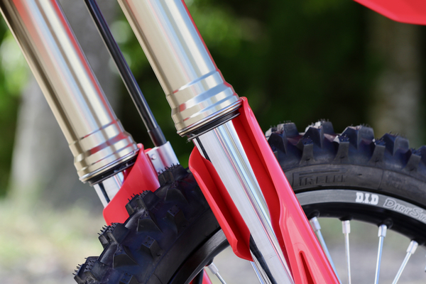 トップブリッジ、ボトムブリッジ、ステムパイプ(ステム勘合長)、フロントアクスルシャフト(シャフト抱き幅UP、ボルト締め付け)が新設計となっています。これによりフロントサスペンション全域でのスムーズな作動性が確保(フロントサスペンション以外のコンポーネントが作動を阻害しない)されています。