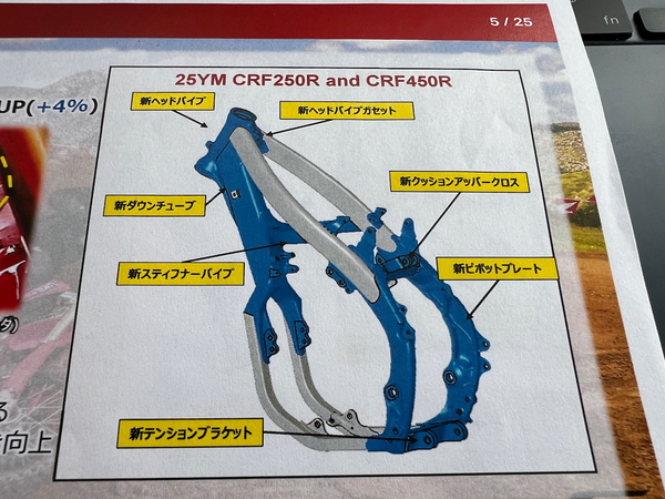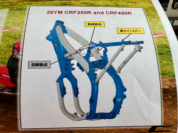 またリアフレームとメインフレームの締結点を変更しています。24モデルまではメインパイプだったのが、ピボットプレートに変更することで、メインフレームの高剛性エリア(クッションアッパーブラケット近く)へ変更し、外乱入力に対する車体挙動の予測性を向上させています。具体的に言えばリアフレームへ外乱入力が生じた際の左右方向、前輪の接地点移動量が旧型よりも27%減とのことで、コーナー進入の際のフロント接地感が向上しているそうです。