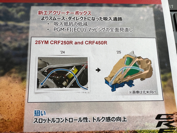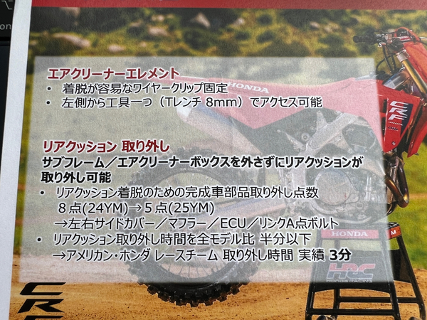 それによると、2024年モデルまでのCRFは軽快性は高いものの安定性に欠けるという北米での評価が定着してしまっており、それを払拭させたかったそうです。そこでCRFの強みである軽快性はそのままに、高い接地感、コーナリング安定性も両立させることに力を注いでいます。