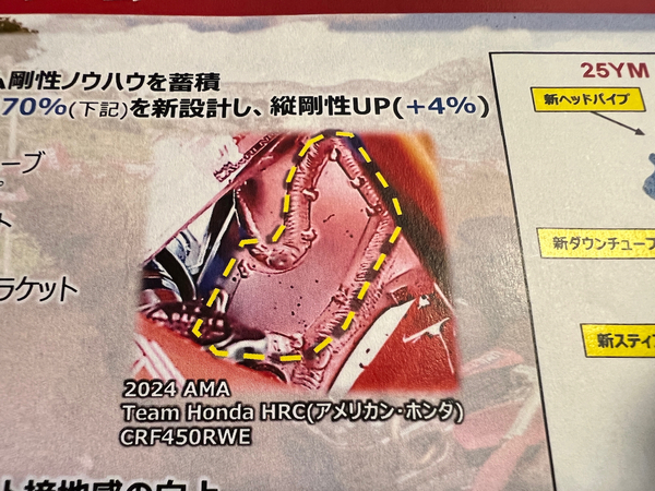 ちなみにこちらは2024 AMA Team HRCのCRF450RWE。市販車での参戦となるAMA用に、ヘッドパイプの縦剛性向上を図るため、レギュレーションで許されているパッチを張って対応したそうです。