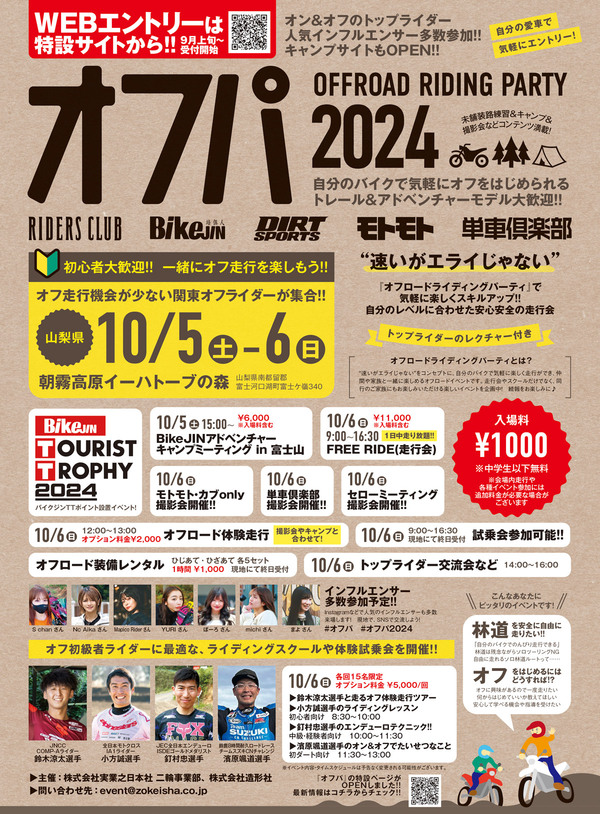 『ダートスポーツ』『単車倶楽部』『モトモト』『ライダースクラブ』『バイクジン』が開催するオフロードイベントが『オフパ2024』こと『オフロードライディングパーティー2024』です。