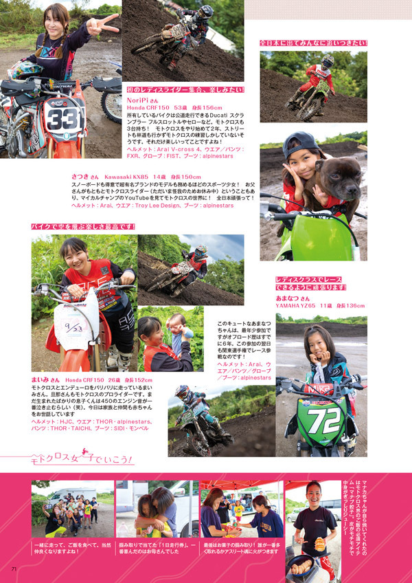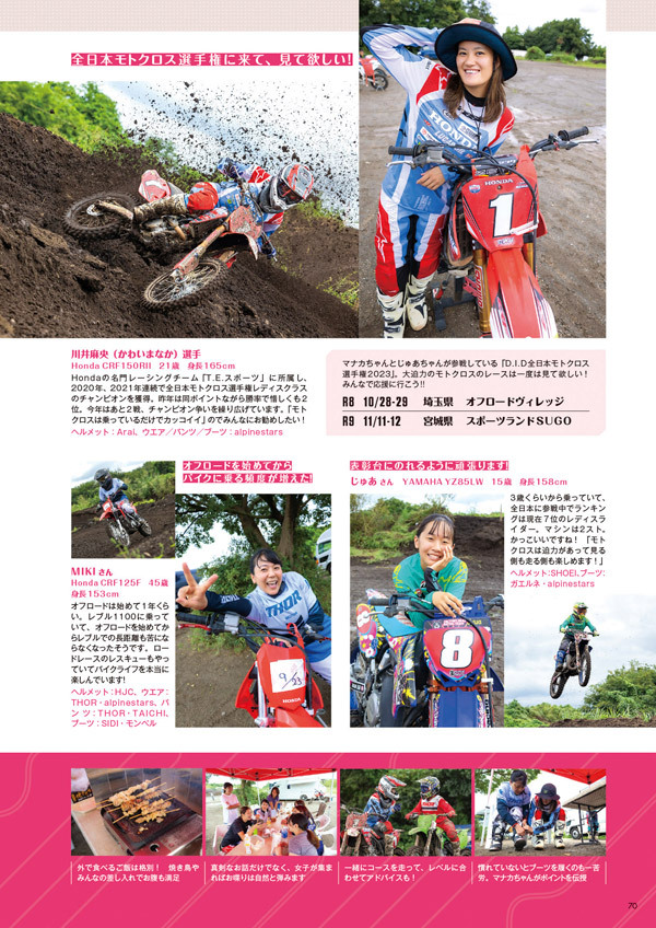 2020、21、23年の全日本モトクロスレディースクラスチャンピオン。レースだけではなく、普通自動二輪免許を取得し、Honda CRF250LやRebel250でツーリングを楽しむ一面も