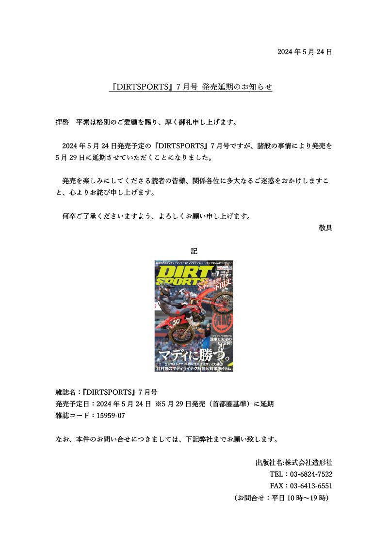 『DIRTSPORTS』7月号 発売延期のお知らせ 2025年12月27日2024年5月24日 by モトコト記事より この記事の著者について モトコト記事より 最近の投稿 イベント2024年10月28日オン・オフのトップライダーが大阪堺カートランドで楽しく真剣勝負!!「ライパGP」11月30日(土)〜12月1日(日) 『オフパ2024』こと『オフロードライディングパーティー2024』2024年10月8日オフパ2024にご参加いただきありがとうございました! イベント2024年9月18日【10月6日はオフパ2024】イーハトーブの森にセローで大集合しよう! イベント2024年9月17日オフロードライディングパーティー=オフパのレンタルバイクを紹介 Follow me! @dirtsports_edit 関連 FacebookXBlueskyHatenaCopy