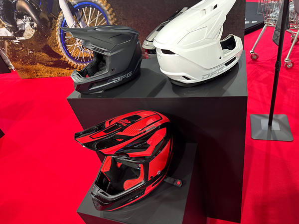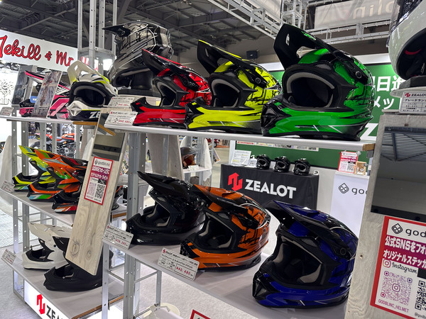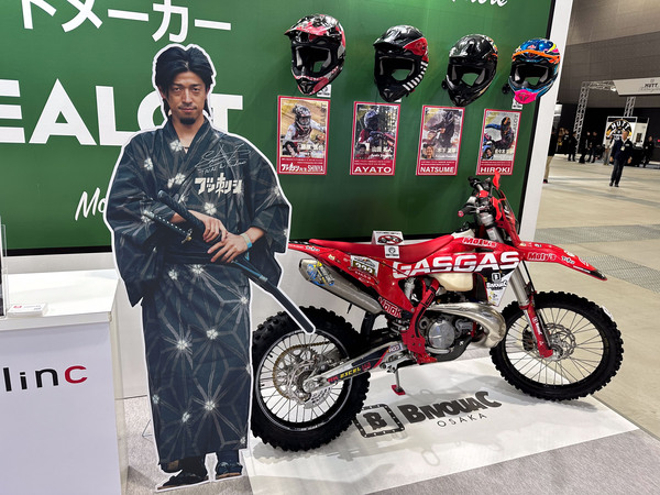 最も軽いヘルメットMadJumper2をはじめ、サポートライダーのホンモノヘルメットを展示、なかでもエルズベルグロデオにチャレンジ中の藤原真也選手のGASGASと本人の等身大ボードも展示!