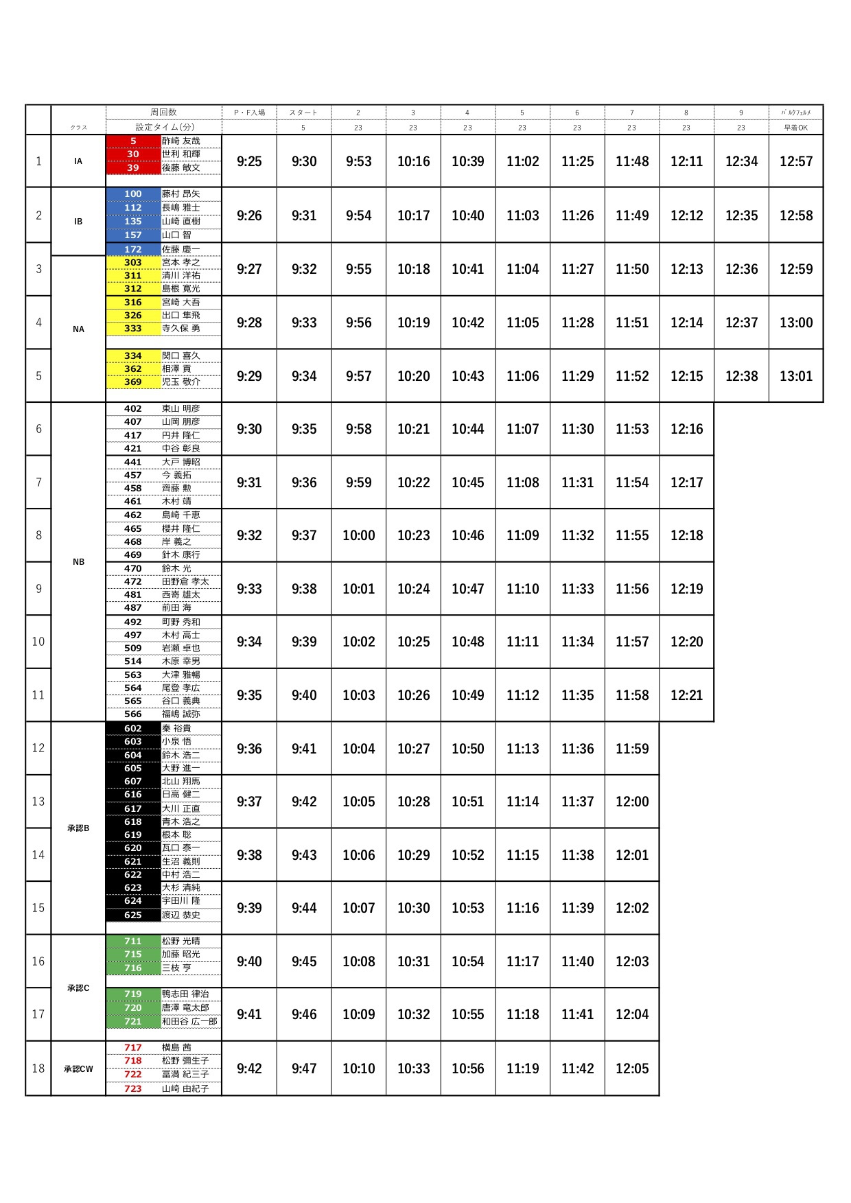 このようなタイム表を受付でもらいます。各人にTC(タイムチェックコントロール)の時間が記載されています。