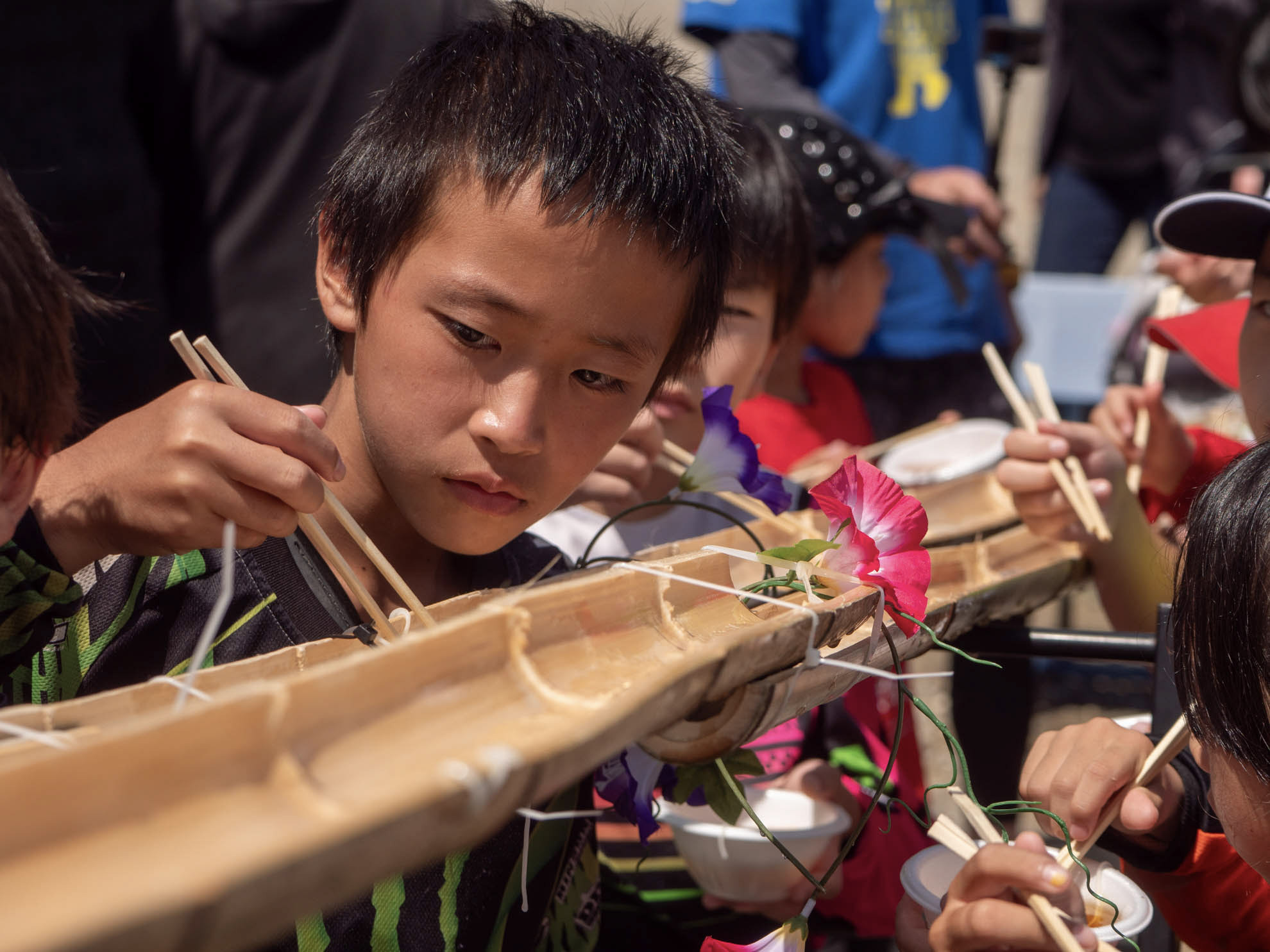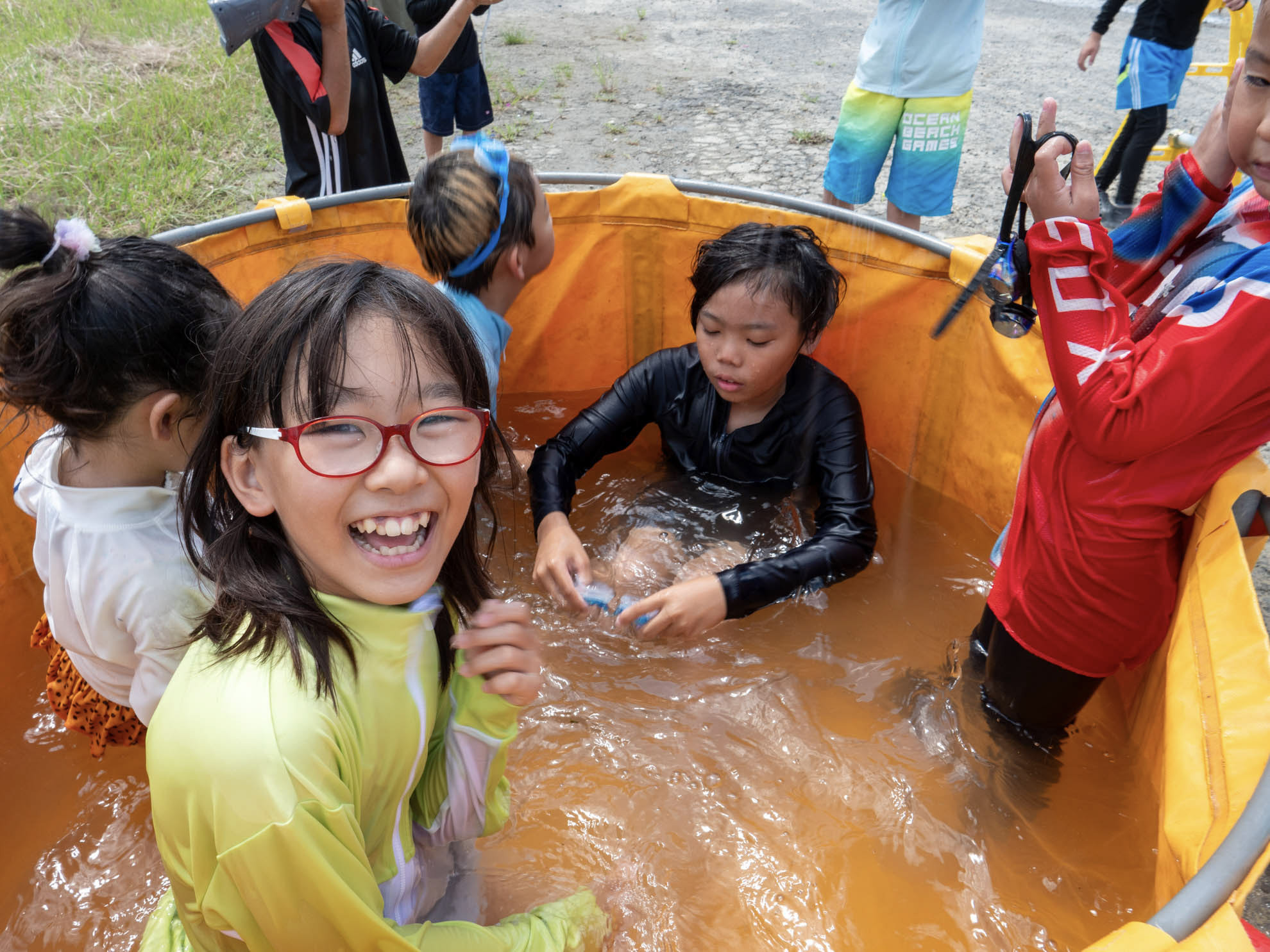 午前中に行う予定だったレースを急遽午後へ変更して、コンディションの回復をみんなで待ちました。走れなくてもキッズは元気! 厳しい暑さが予想される夏休みスペシャルは、毎年レースは1ヒートのみ。熱中症対策も兼ねて、ウォータースライダーや水遊びをしています。今年は水遊びに加えて、みんなで流しそうめん。竹の流しそうめんセットを手作りしました。初めての流しそうめん体験にみんな大はしゃぎ。上手にキャッチできない小さいお友達のためにみんなでお手伝いしている様子は、とても微笑ましい光景でした。