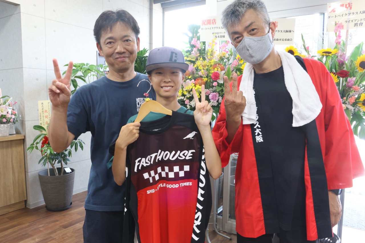 オープニングセレモニーのテープカットはダートフリーク石田社長、ダートバイクプラス大阪店の太田店長、そして我らがにゃんばちゃんこと難波祐香さんが担当。