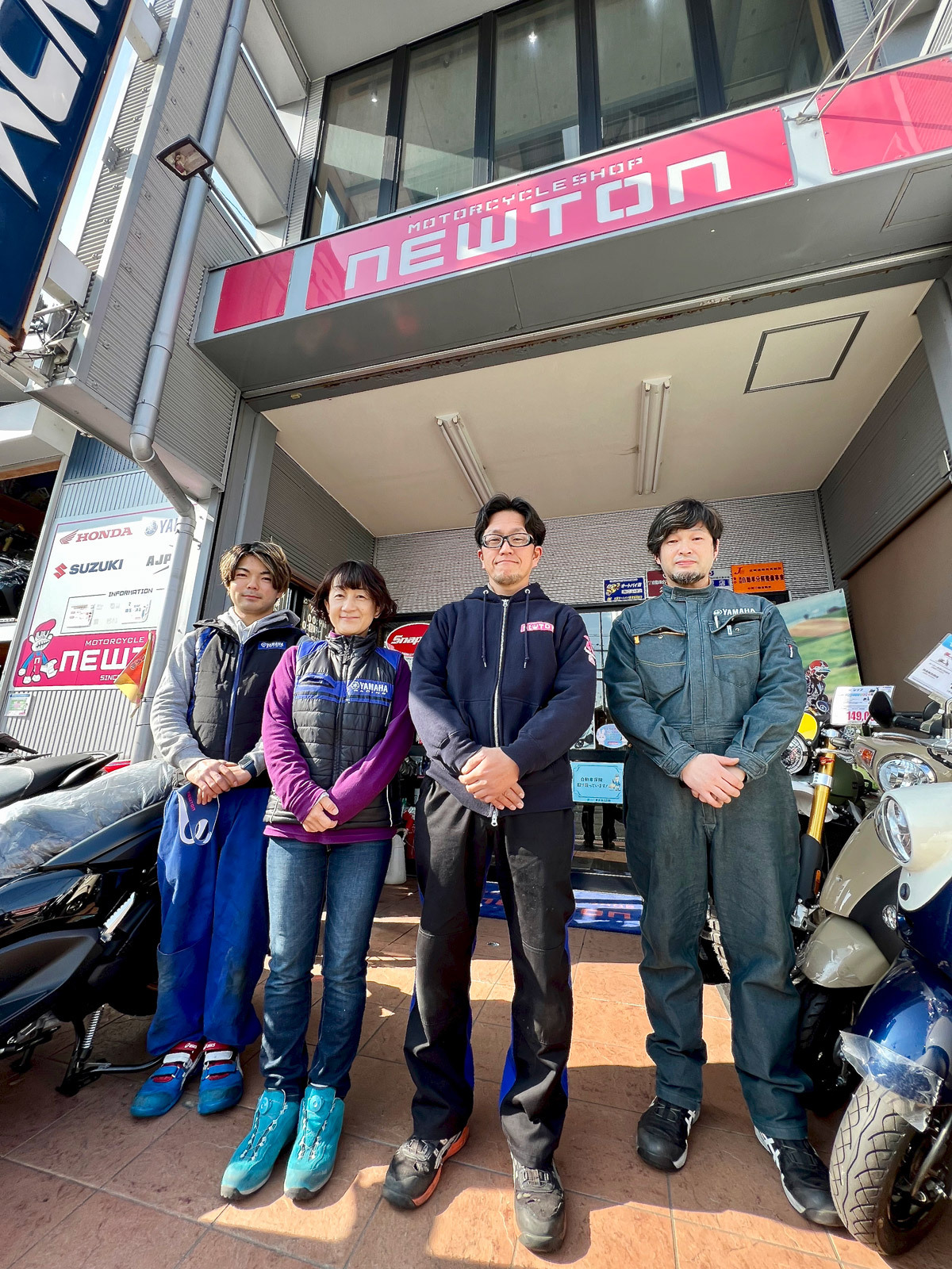 東大阪市に店を構えるモーターサイクルショップ ニュートンの代表を務める通称「てんちょ」。エンデューロをはじめとするレースにも積極的でオフロードに強いが、あくまでも「街のバイク店」であることにこだわりを持つ。写真はスタッフと一緒に店前で。奥様の比佐さんもエンデューロライダーで、結婚後二人で店をオープンさせた