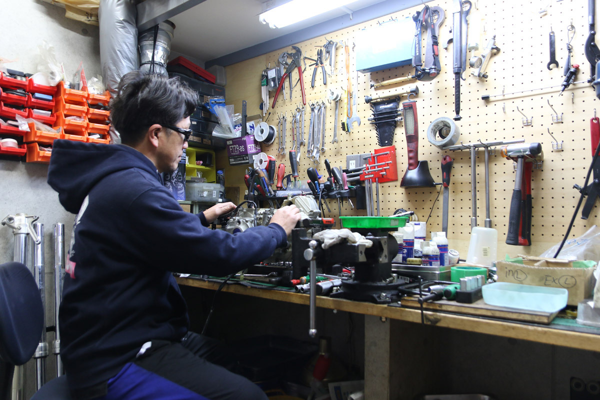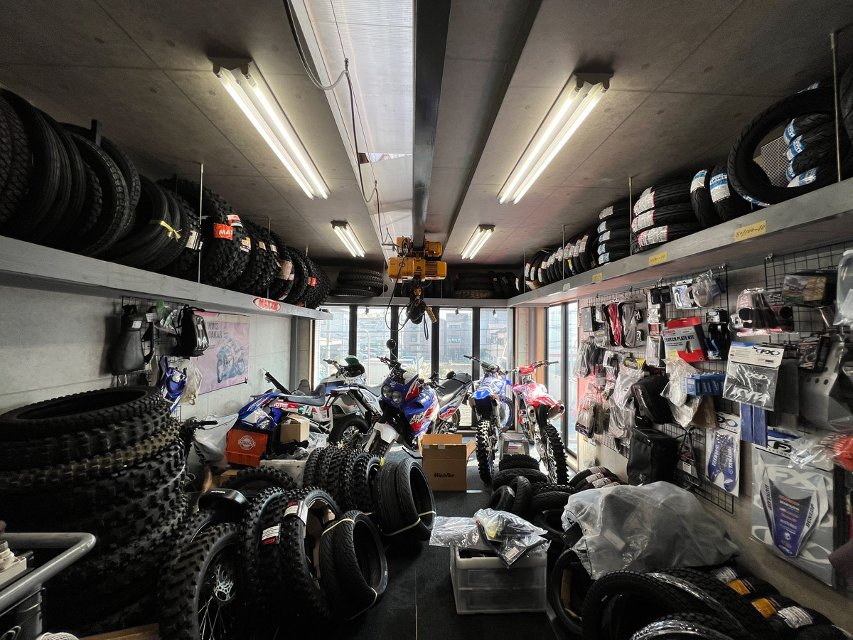 今でこそオフロードバイクに強い店だが、最初からニーズがあったわけではない。開店して3年目くらいから徐々に、好きだったオフロードバイクに復帰し、コースで仲間も増えて、少しずつオフロード主体に変わっていったのだ。 「『オフロード専門ですよね?』と言われることもあるんですけど、絶対に『普通のバイク屋です』と答えているんです。明日仕事に行かないといけないおっちゃん、おばちゃんのニーズは生活に直結しているから、本当に重要。『そっちもほんまに重要やねん』とお客さんにも言ってます。もちろん、レースにも万全の態勢で出てもらいたいので、決して手は抜けません。今の悩みは、おかげさまで少しずつ名前も知って頂いてきましたけど、キャパシティに限界があることですね。ありがたいことですけど、一般の整備はスタッフに任せきりでなかなかできないので、少しずつ改善しているところです。整備が普通にできる店が減っていますね。本当に困っている人は助けなくてはいけない。そこが本当に悩ましいです。」