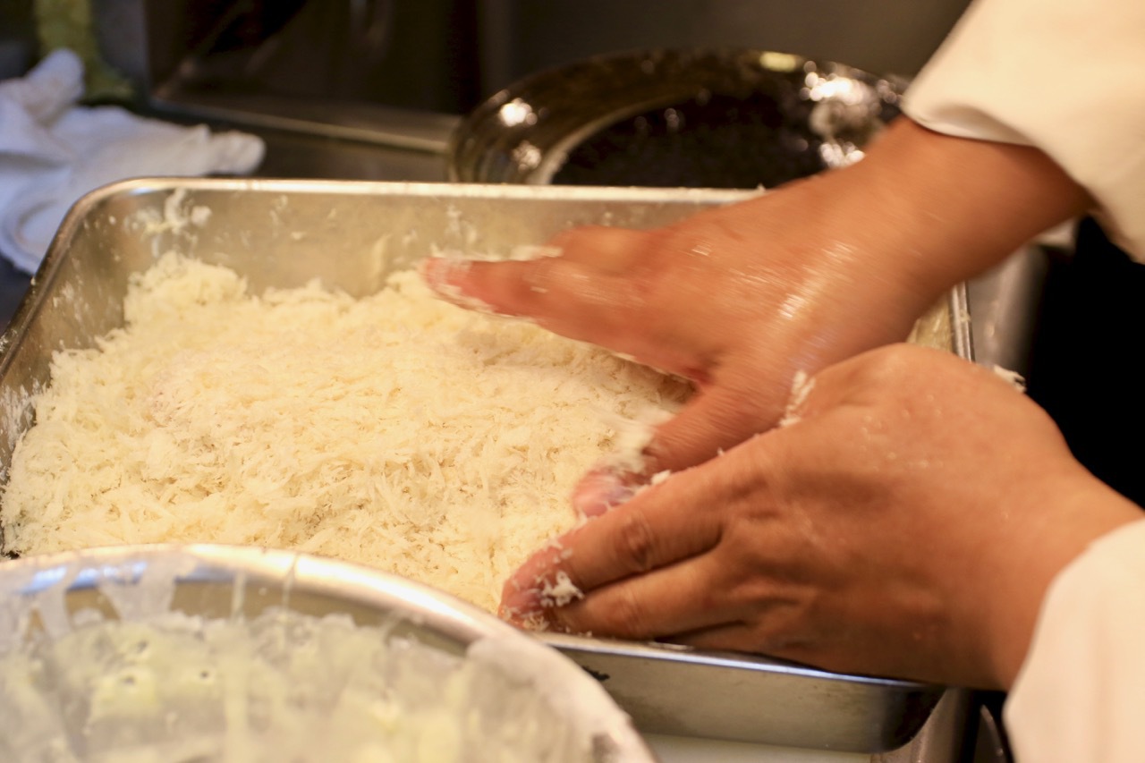 肉の叩き、繊維を切り、伸ばした後に肉寄せを行う手作業に思わず見とれます。