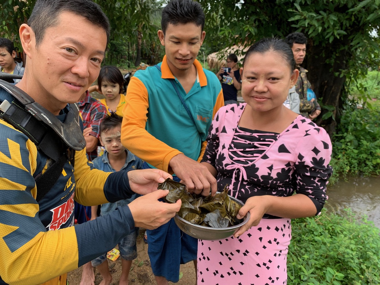 タイを出発し、山、川、ジャングル、農道や国道などあらゆる路面をラリー競技として走り、ミャンマーへ辿り着いた我々。そこには全力で歓迎してくれる学生や、訪れた村では、笑顔で受け入れてくれた姿がありました。ミャンマーも国をあげての参加ということで、ライダーも参加されていました。SSスタート前に村人からいただいた、チマキのようなお菓子のありがたさは忘れられません。頬にタナカを塗り、どこの人も笑顔で迎えてくれたミャンマーの人達の安全と幸せを切に願います。