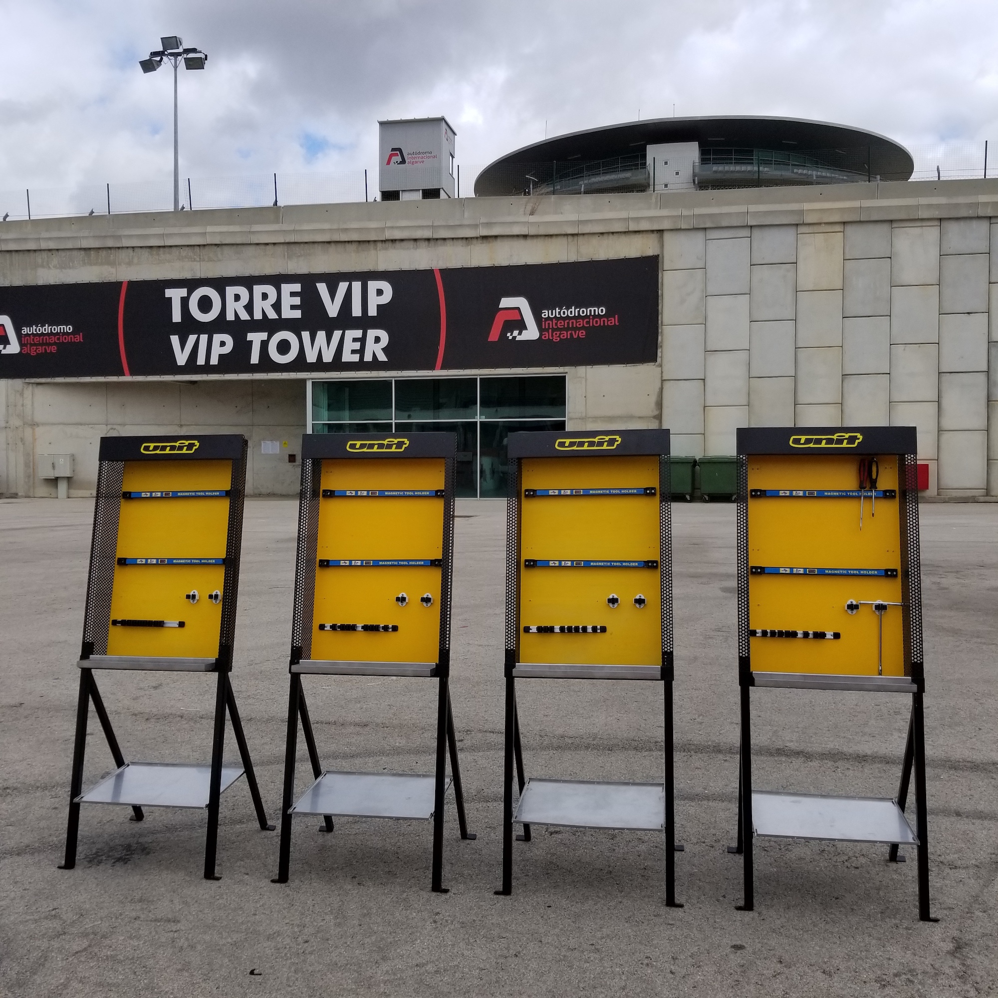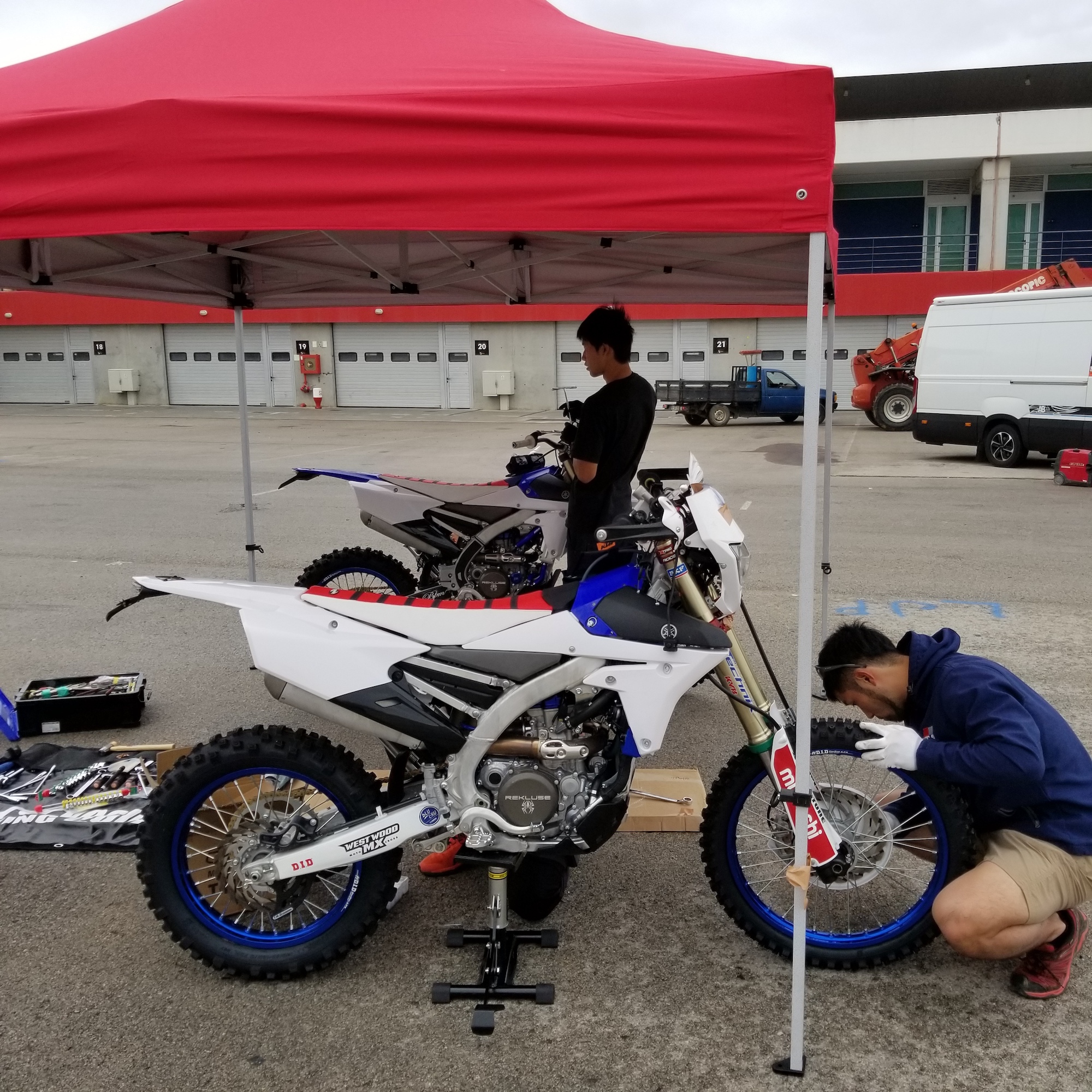 一足先に着いた為、日本から発送したヤマハのマシンや機材、タイヤ、パドックの設営準備! ワーキングエリアで使用するUNIT製の工具掛け(試作品)、タイヤはDUNLOPのEN91!