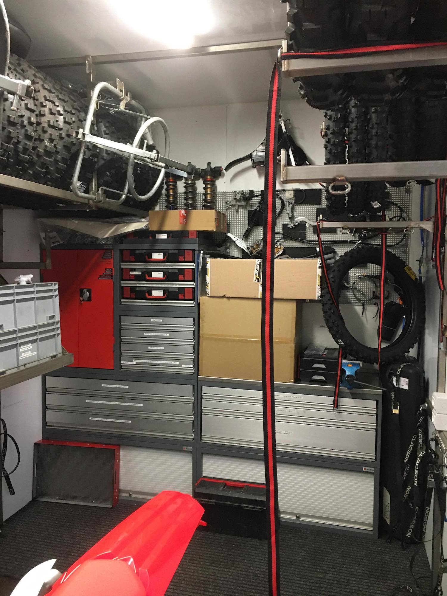 Red Motoのトラック内に潜入! 後ろはスペアパーツや特殊工具があり、トラブルにも備えて作業台もありました! トラックの中央〜前方には6つのベット、トイレ、シャワー、キッチンもあり世界選手権を戦う十分な装備がありました!