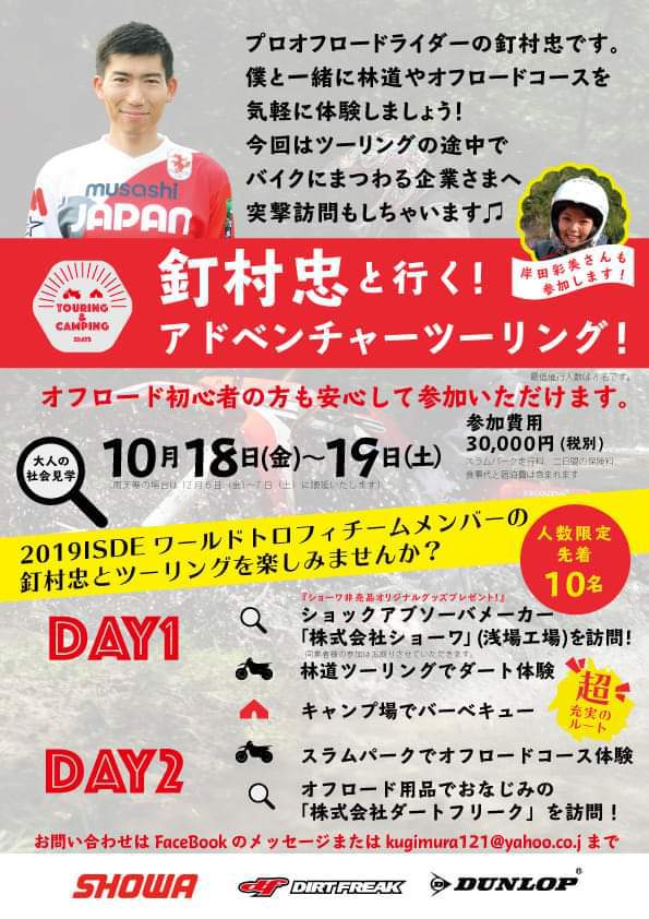 プロオフロードライダーの釘村忠選手が、楽しいイベントを開催してくれますよ!