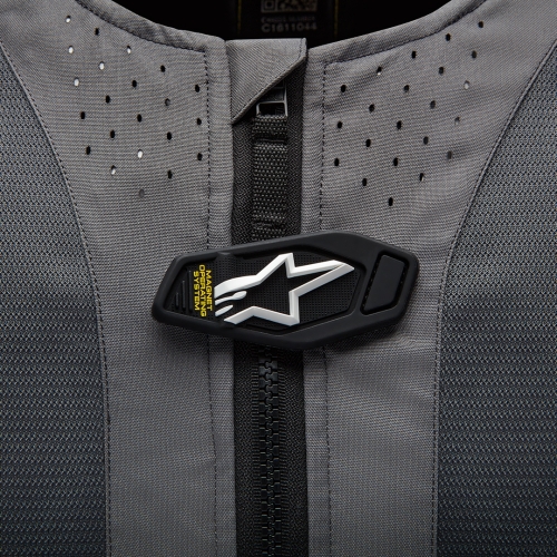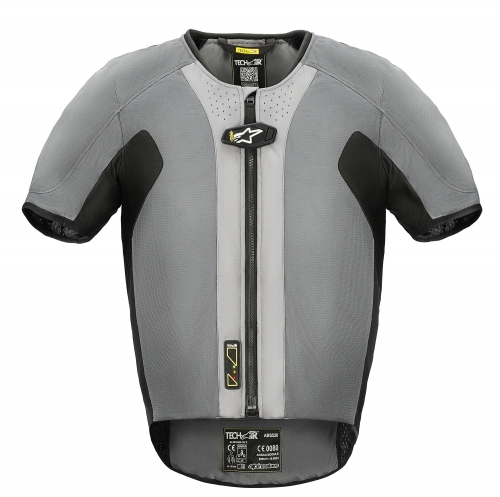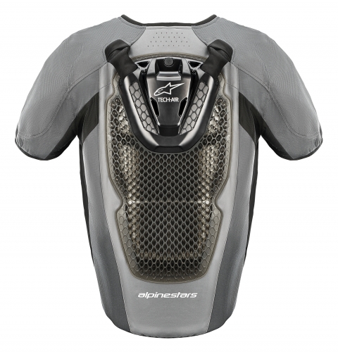 「TECH-AIR5」はジャケットの中、つまりインナー的に着るものです。エアバッグが作動したときのことを考えて、胸囲で4cmくらいの余裕があるジャケットを着用してくださいね。alpinestarsのウエアにはTECH AIRに対応したジャケットもラインナップしていますので、岡田商事のHPをチェック! また、ライディングジャケットの肩・肘・胸部プロテクターはそのままで構いませんが、脊椎プロテクターは「TECH-AIR