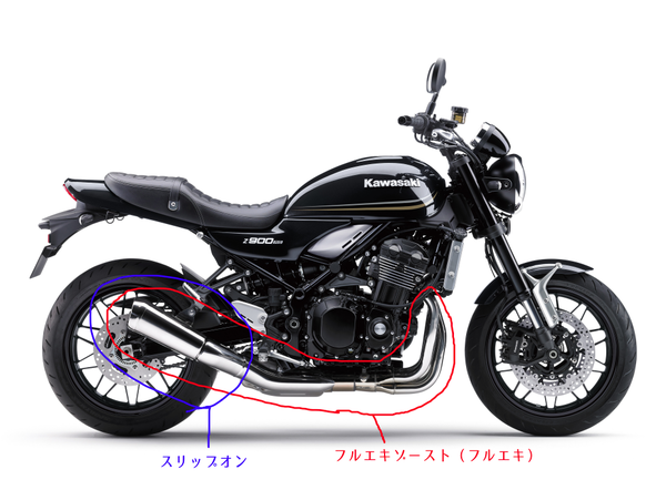 ところで「マフラーって何?」って言うガールズバイカーもいると思いますので、ここで説明しますね!写真はカワサキのZ900RSというバイクです。