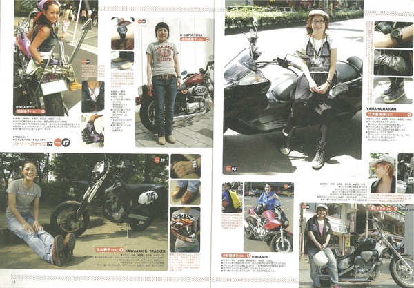 約12年前の雜誌ですが、今みているとやっていることはあまり変わってないな〜と苦笑…。でも登場しているガールズバイカー達には大きな変化があります。それは服装。当時はみんなTシャツやタンクトップで乗っている女性が多かったのかな。今では考えられないですよね。今はプロテクターが装備された、女性専用のバイクアパレルを着ている人がほとんどですが、当時はまだあまり浸透していなかった記憶があります。ラインナップもとても少なかったですが、今はたくさんの中から選べるようになって、安全ながらおしゃれも楽しめるいい時代になりました。