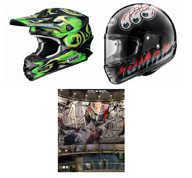 HIGHJUMPER氏は、RedBull、Monster Energy、Coca-Cola、無限、DAIHATSU、Arai、SHOEI、Troy Lee Designなどに作品を提供しています。