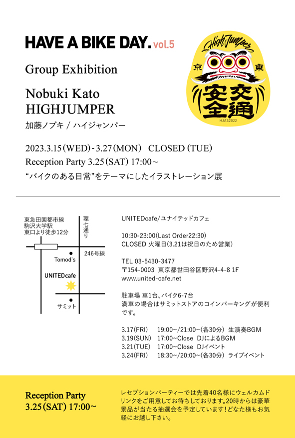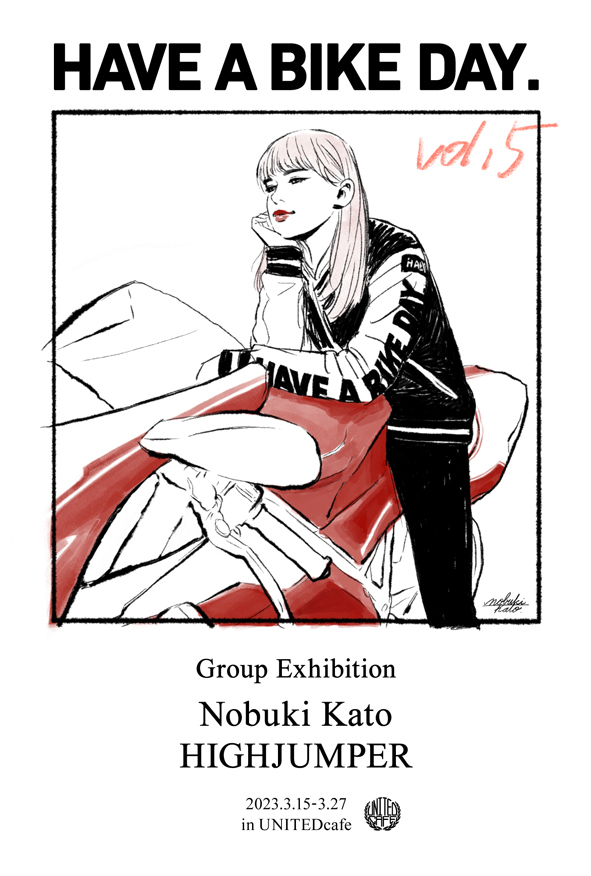 加藤ノブキ氏とHIGHJUMPER氏によるバイクをテーマにしたイラストレーション展。