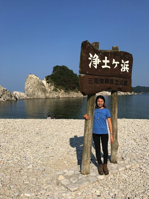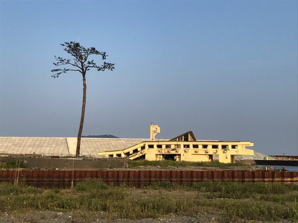1日目の最終目的地として訪れたのは、陸前高田市気仙町にある奇跡の一本松。2011年3月11日に起きた東日本大震災の津波被害を受け、ここにあった約7万本の木々が流され無惨な姿になった中で、唯一耐え残った1本がこの松の木だったそうです。震災の翌年には海水で根が腐ってしまい、枯死してしまったことが確認されましたが、記憶を風化させないためにモニュメントとして残されています。松の木の後ろにある建物や、その周辺いたたずむ住居人のいないマンションは当時のままで、何度もニュース映像で見たシーンが蘇り、胸が苦しくなりました。この周辺の道路は整備され、車の行き来もありましたが、道路以外のところはまだ土のままで、ショベルカーなどの重機が忙しそうに動きまわっていたのでした。私たちが訪れることで、何か少しでも復興の役に立てれば…と思います。