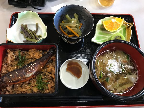ちなみに掲載しているのは建物の写真ではなく、ここでいただいたお昼ごはん。郷土料理である“イワナかで飯”と“ひっつみ”です。イワナのご飯はダシと甘いタレが最高。素朴な味わいでした。