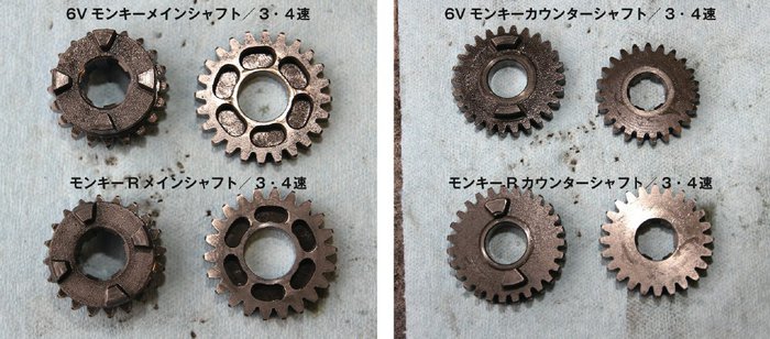 純正ミッションを流用したクロス化はモンキー界では割りとよくある手法ですが、ロータリードラムを使って、それをカブでやるというのがミソだとはカビィさん談。6Vモンキーのメインシャフト側3・4速とモンキーRのメインシャフト側3・4速を入れ替え、6Vモンキーのカウンターシャフト側3・4速とモンキーRのカウンターシャフト側3・4速を入れ替えることでクロスとなります。