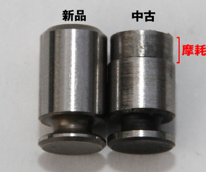 中古をベースにする場合、シフトフォークガイドピンは原則新品にしよう。左が新品で右が中古。段差ができていますが、これは削れている証拠なんです