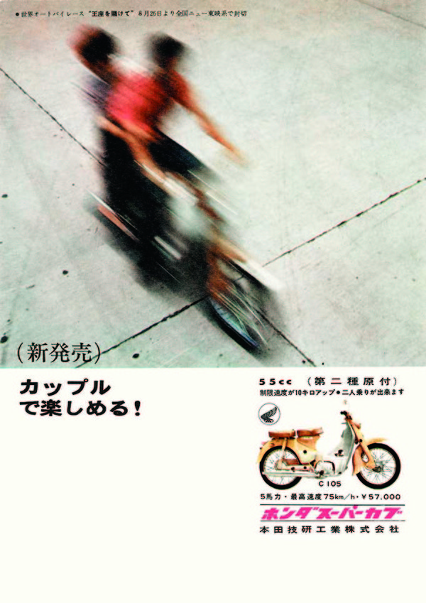 制限速度が10キロアップ●二人乗りが出来ます ……C105が発売されたときの広告です。5馬力、最高速75km/h、\57,000と表記されています。ホンダが世界を制覇したマン島TTレースなどの熱戦を収録した、世界オートバイレース「王座を賭けて」という映画が放映された1961年の広告です