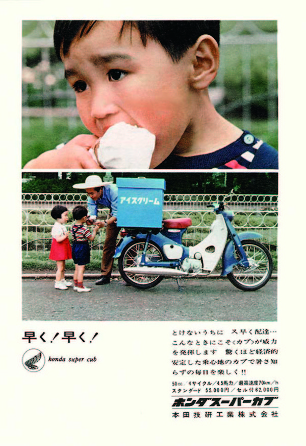とけないうちに ス早く配達…こんなときにこそ〈カブ〉が威力を発揮します 驚くほど経済的 安定した乗心地のカブで暑さ知らずの毎日を楽しく!! ……アイスにかぶりつく男の子がメインに採用された広告。かわいいぃ~!
