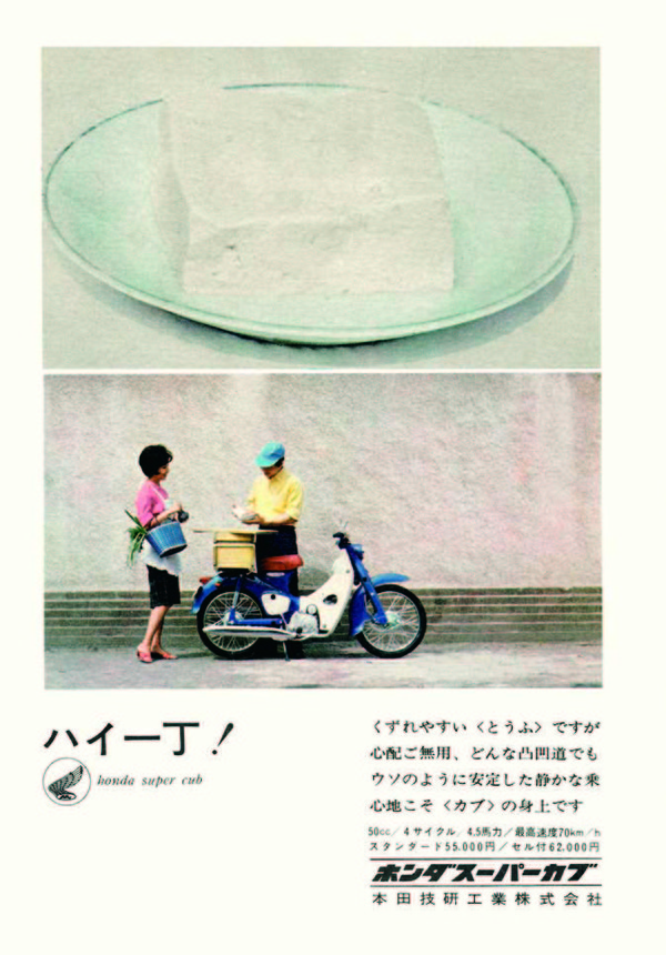 くずれやすい〈とうふ〉ですが心配ご無用、どんな凸凹道でもウソのように安定した静かな乗心地こそ〈カブ〉の身上です ……「とびあがる!」の次に衝撃を受けたのがこちら。とうふの写真がメインだなんて…